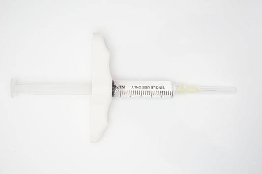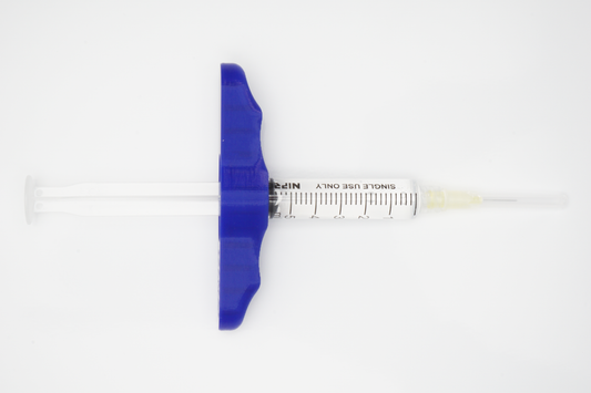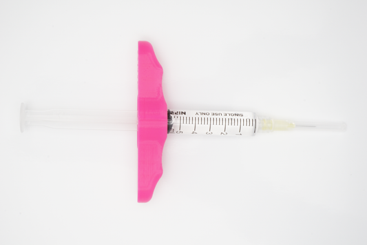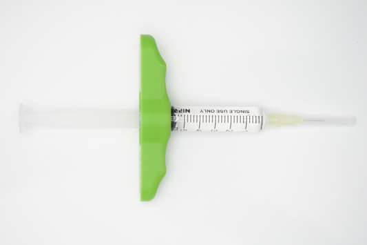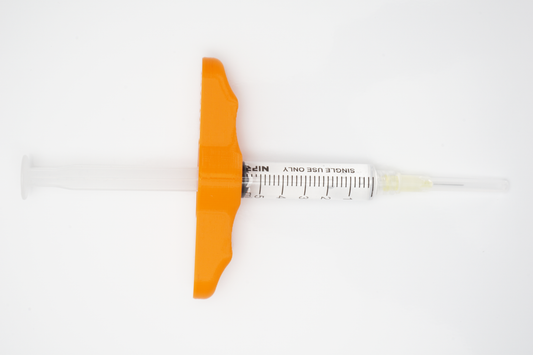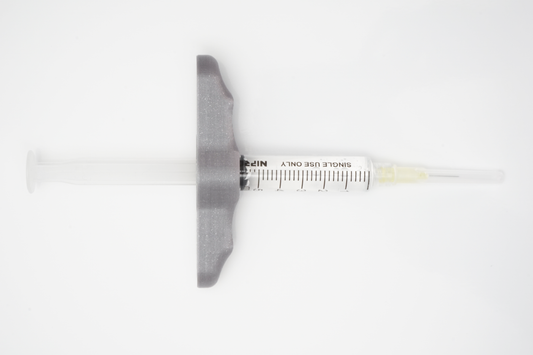 The SyringeGrip was originally developed as a one-off project for a group of Perineural Injection Therapy (P.I.T.) doctors who got strains from continuously using single-use syringes. The small handles of the syringes don't provide much grip, resulting in sore hands after a working day.